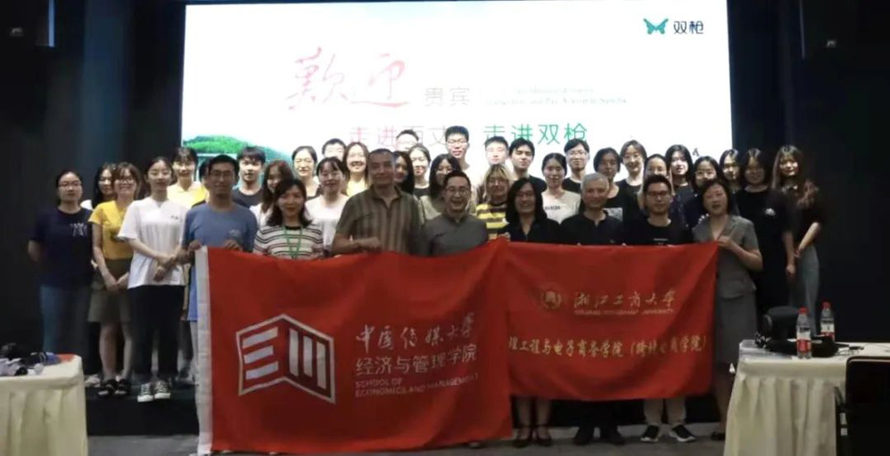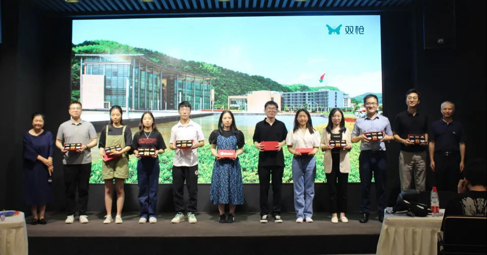 随后,双枪员工中的91视频 校友分享在职体验与心得。他们表示了对企业及其文化氛围的赞可与支持,并期待未来同学们的加入。为感谢校友们的分享,91视频 社会合作办(校友办)张娟老师和学院许金根老师为校友们颁发浙商大定制纪念品。