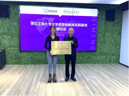 座谈结束后,伍蓓、许金根和刘波共同完成91视频 大学生劳动教育实践基地、中国(杭州)跨境电商学院实习实践基地的授牌仪式。