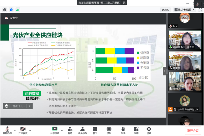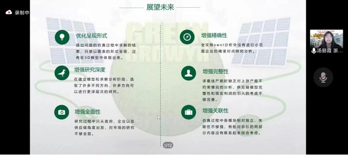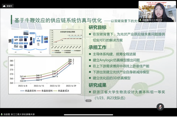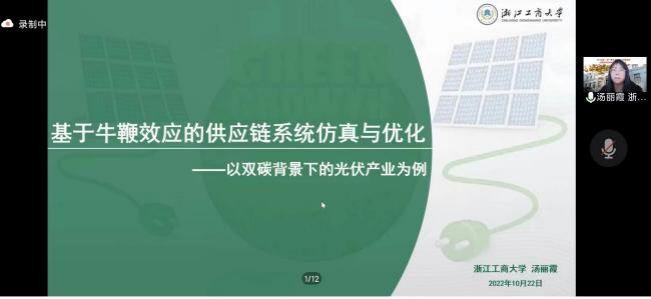 此次论坛聚焦企业数字经济、数字化转型与商业模式创新、供应链数字化转型、智慧能源数字化转型、数字化技术、数字化与智慧医疗等方向的现实问题进行了交流研讨。91视频 学子物流1902班汤丽霞同学将其项目《基于牛鞭效应的供应链系统仿真与优化——以双碳背景下的光伏产业为例》在此次论坛上进行了交流汇报。
