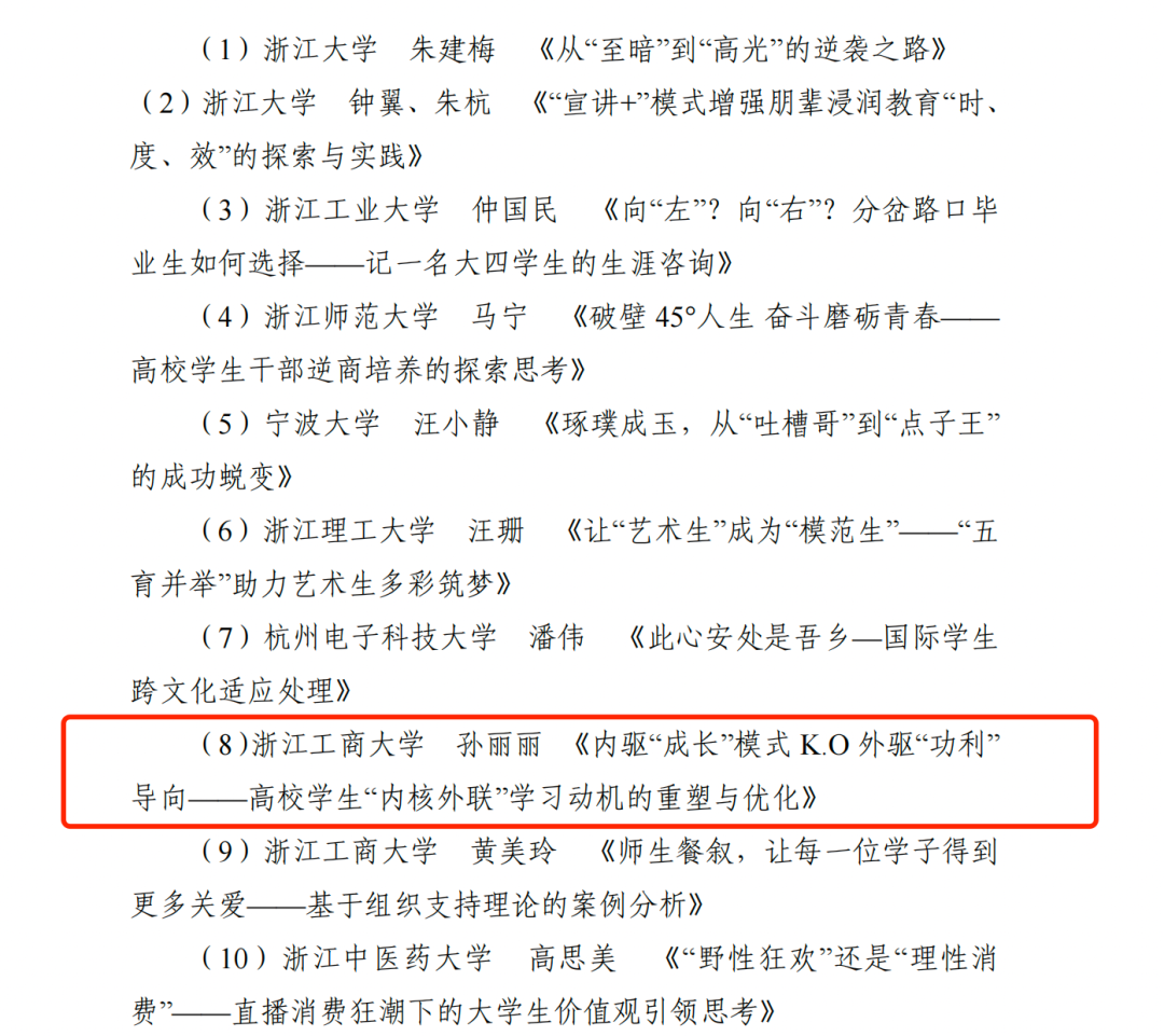 第五届浙江省高校辅导员工作案例大赛评选结果日前揭晓,91视频 孙丽丽老师撰写的《内驱“成长”模式 K.O 外驱“功利” 导向——高校学生“内核外联”学习动机的重塑与优化》喜获浙江省三等奖