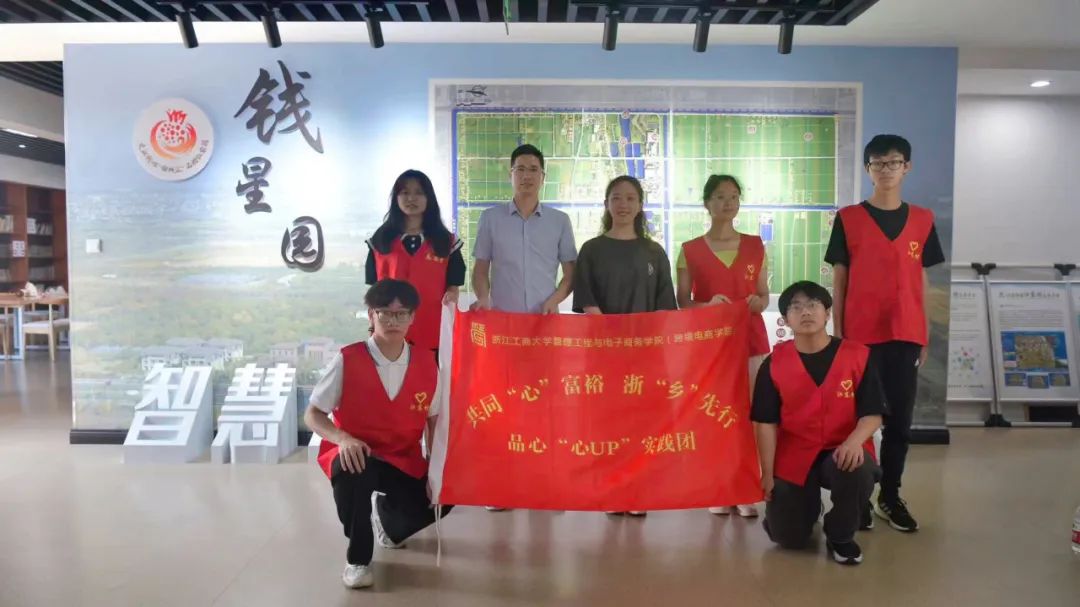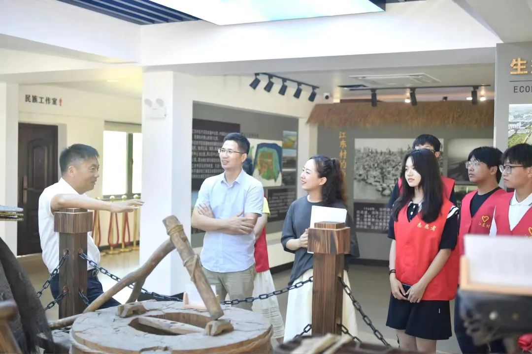 会议后,林书记亲切慰问团队成员,了解实践实际开展的相关情况,并叮嘱注意人身安全,再次表达了学院对暑期社会实践团队的关心与重视。最后,江东村方建庆书记带领林瑜茂书记和共同“心”富裕、浙“乡”先行实践团的成员们一同参观了“智慧漫居,田城江东”乡史馆,深入了解当地的历史文化。从一代代一任任书记、领导班子的变迁到村委会地址的转变、从乡村土地规划布局到乡村未来发展、从未来社区建设到特色乡村节日介绍,让副书记和成员们更加深入地了解了江东村。