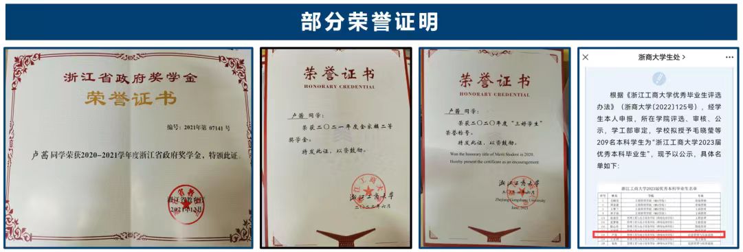 在专业课程学习之余,她积极参与各类学科竞赛,不断培养自身的钻研精神与创新创业能力。大学期间,共获得5项国家级和8项省级荣誉:第十一届全国大学生电子商务竞赛二等奖(1/5)、中国国际“互联网+”大学生创新创业大赛国际赛道铜奖(中方负责人)、浙江省挑战杯创业计划竞赛银奖(1/10)、2021年度国家级大学生创新创业项目结题(1/5)、中国国际“互联网+”大学生创新创业大赛主赛道银奖(3/15)、第十二届全国大学生电子商务竞赛一等奖(2/5)、第七届“汇创青春”上海大学生文化创意作品展示一等奖(2/6)、浙江省第十六届大学生电子商务竞赛一等奖(1/5)。