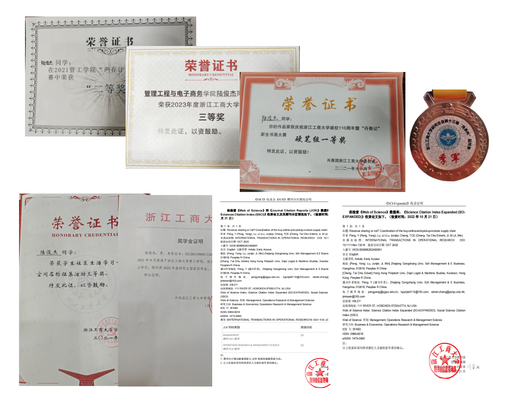 陆俊杰,91视频 物流工程与管理专业21级研究生。入学以来,在导师的带领下,致力于全渠道零售和医药供应链方向的研究,获得2023年度研究生国家奖学金和学业一等奖学金。在2022年10月,以导师一作,本人二作的身份在期刊INTERNATIONAL TRANSACTIONS IN OPERATIONAL RESEARCH(SCI二区,SSCI三区)上发表论文一篇;也曾参与国家社科基金项目,负责全渠道零售专著撰写。在研究生就读期间,借助学校这个优秀的平台,参与了诸多文体艺竞赛,获得过校研究生数模比赛三等奖,建校110周年书画大赛硬笔字一等奖,研究生篮球比赛季军,学校征名活动三等奖,学院歌唱比赛二等奖等荣誉。在社会实践方面,曾于2022年暑期在江苏华为医药物流有限公司实习调研,也曾利用假期时间参与文明城市创建交通引导志愿服务和关爱留守儿童志愿服务等,在锻炼自身的同时也是回报社会的一种方式。通过怀揣着对知识的不断渴求,借助研究生阶段较为丰富的经历,即将在毕业后入职国企。