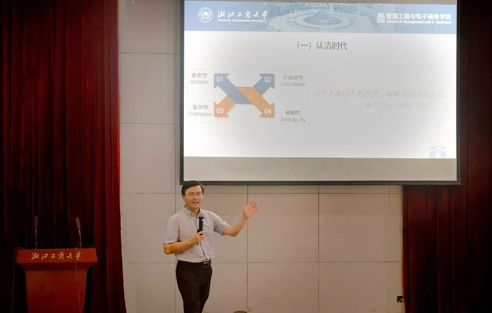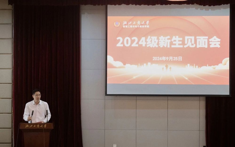 在会议的最后环节,院长厉小军发表了题为《拥抱变化,培养未来竞争力》的讲话。他首先向全体新生介绍了学院的基本情况,涵盖了学院历史、专业设置、师资力量、教学科研平台、教学科研成果等方面。随后,厉院长从自己本科毕业近三十年的经历出发,向新生同学表达了他的建议与期望。他强调,作为新时代的大学生,我们应认清时代的变迁,牢记“无人能够左右变化,唯有走在变化之前”的哲理,积极拥抱变化,培养自己适应变化的能力。同时,要学会如何高效学习和做好时间管理,注重学习解决问题的方法与思维,重视线上学习和向AI学习。厉院长还提到,我们要体味生活中的“无用之用”,读无用之书;更要保持身心健康,为美好的未来注入源源不断的能量。在讲话的尾声,他激励同学们在大学期间不仅要趣学专业,更要全面发展,成为一名真正意义的“大学生”。