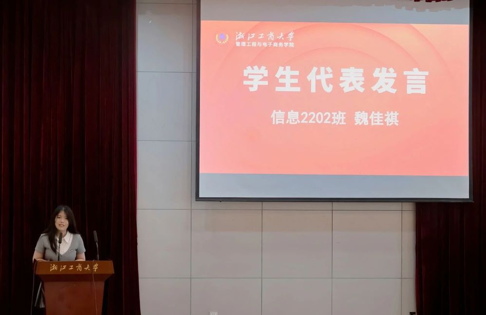 信息2202班魏佳祺同学作为老生代表发表讲话。她分享了自己的大学经历并给予新同学建议。首先,她强调大学是新旅程的起点,鼓励新生设定人生目标。同时,她提醒大家在大学中要注重独立思考和学习,克服信息过载的挑战。最后,魏佳祺同学还强调要把握住学院提供的各种资源和机会,积极参与,全面发展。