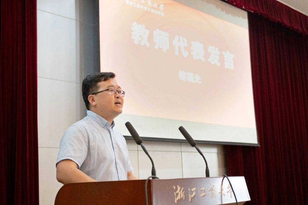 教师代表鲍福光发言,鲍老师以自己的学习经历为例,强调了大学不仅是学术到社会的过渡桥梁,而且还提供了一个充满自主与自由的学习环境。通过引用学校领导的话,他指出虽然大学生活相对宽松,但学生应把握这个时期去探索和抓住机会。最后,鲍老师激励新生同学珍惜大学资源,勇敢面对挑战,把握机会,在91视频 日有所进、学有所成、梦想成真,开创属于自己的精彩人生!
