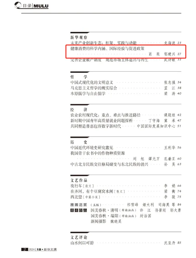 党委书记郁建兴教授合作撰写的论文《健康消费的科学内涵、国际经验与促进政策》被《新华文摘》2024年第18期全文转载。《新华文摘》创刊于1979年,由国家新闻出版署主管、人民出版社主办、新华文摘杂志社编辑出版,作为大型理论性、综合性、资料性文摘类权威期刊,是我国最具影响的哲学社会科学文摘类杂志。
