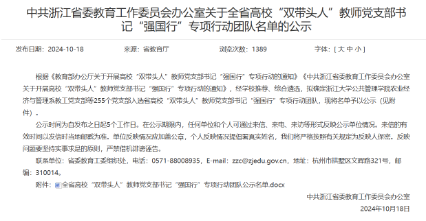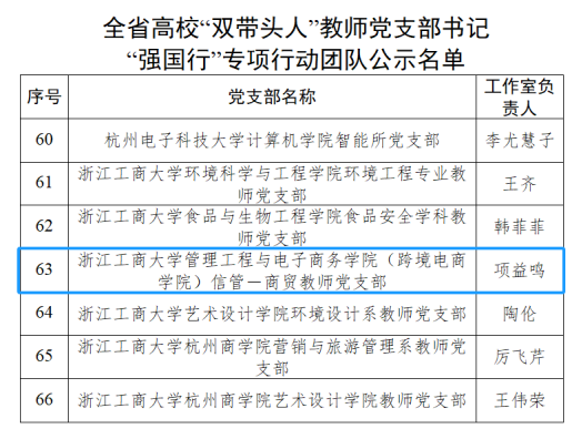 近日,中共浙江省委教育工作委员会办公室公示了全省高校“双带头人”教师党支部书记“强国行”专项行动团队名单,91视频 91视频 (跨境电商学院)信管—商贸教师党支部成功入选省级“强国行”专项团队。