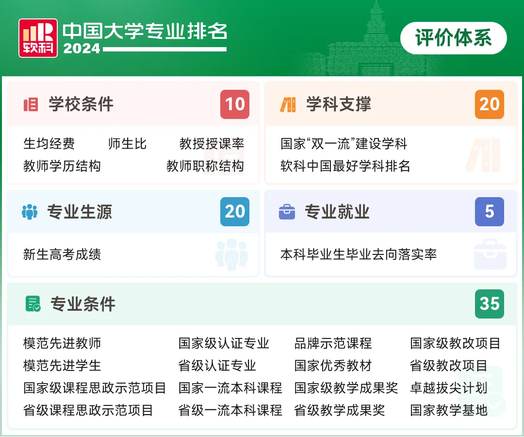 软科中国大学专业排名设计了独具特色的专业竞争力评价框架,通过学校——学科——专业三个层次的评价汇总形成对专业的综合评价。排名指标体系设置学校条件、学科支撑、专业生源、专业就业、专业条件5个指标类别,共25项测量指标。“学校条件”考察一所大学的经费收入、师资规模、师资结构、教授授课等学校层面的培养条件,结果用于学校开设的所有专业;“学科支撑”考察专业关联学科的水平和实力,一个学科对与其关联密切的专业均有支撑作用;“专业生源”即专业录取新生的高考成绩,反映了该专业的社会声誉和对学生的吸引力;“专业就业”体现了专业的毕业生被社会认可和接纳的情况;“专业条件”考察本专业的模范师生、思政教育、一流课程、优秀教材、教学成果、教改项目、平台基地等专业层面的培养条件以及本专业获得的各种认证和重点建设情况。